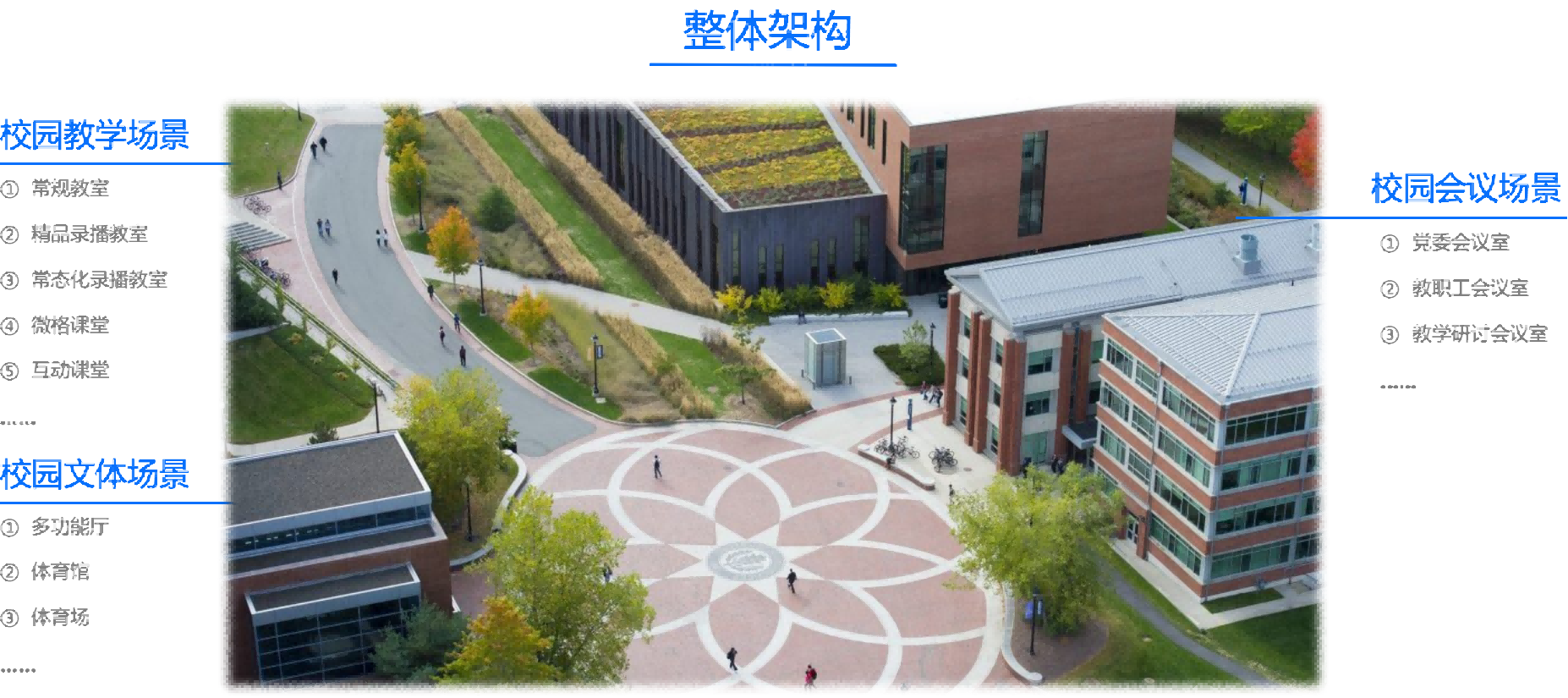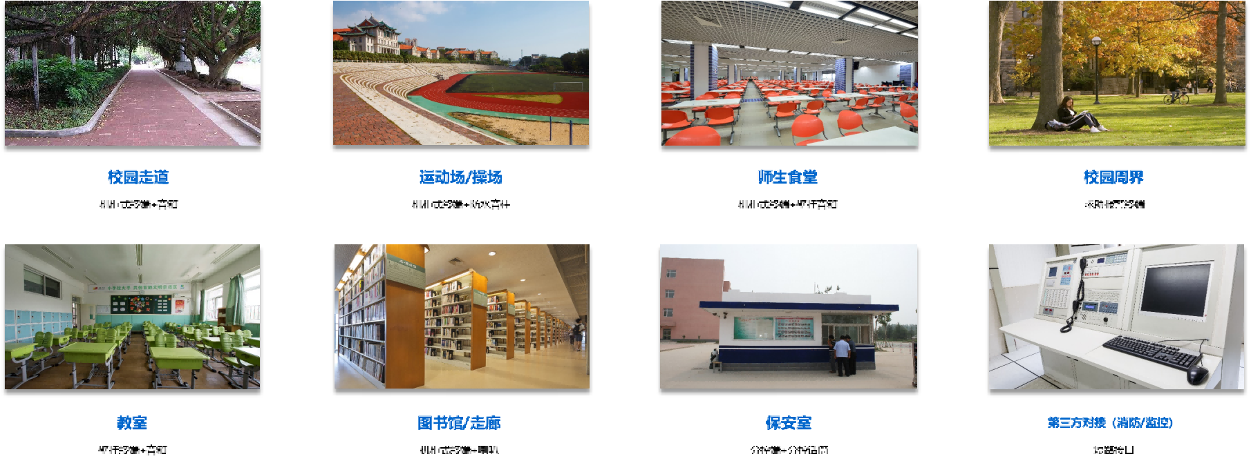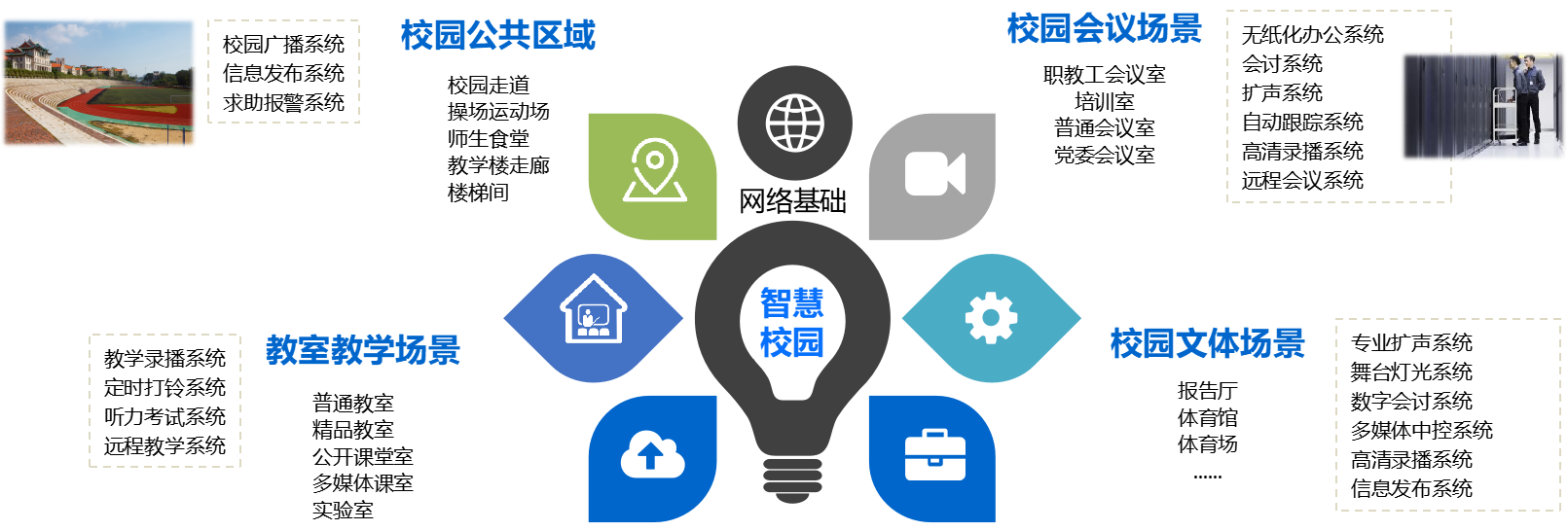 校园广播系统:校园广播系统主要覆盖教学楼、实验楼、综合办公楼、图书馆、宿舍楼、校园主干道、风雨操场、运动场等场所,校园广播系统满足学校日常教学功能需求。