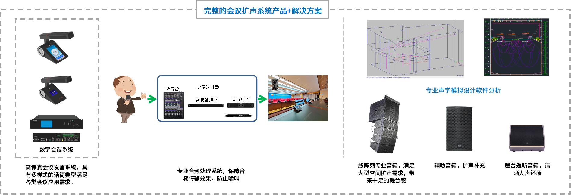 ● 音响扩声系统主要包括节目信号源、信号处理、功放、音箱等内容,通过先进的设计理念及高品质的设备配置,营造完美的音响效果,满足会议室、多功能厅、报告厅的发言、汇报、演讲、讨论等,能达到清晰反馈人声讲话的目的。