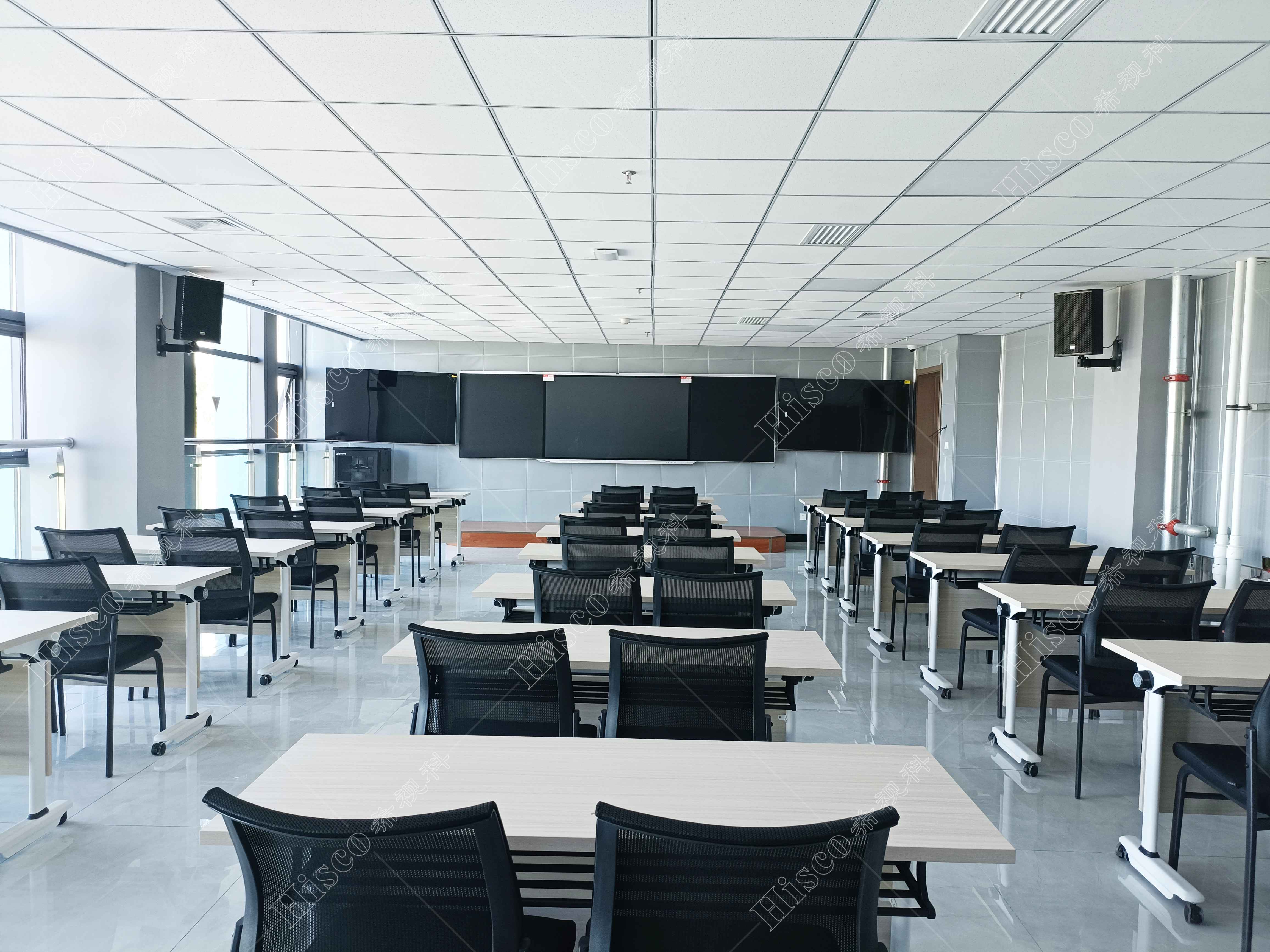 多功能培训教室主要用于银川市工人员工培训、学术交流、会讨或者是给少先队等机构进行培训使用等功能。培训无疑是市民文化提高,素质增强的重要手段。在显示系统的选型上,满足日常培训的PPT观看,视频会议显示等功能,配置2台75寸液晶电视。扩声是配置2只10寸的高音质全频音箱,声压可均匀覆盖,平均声压98dB。